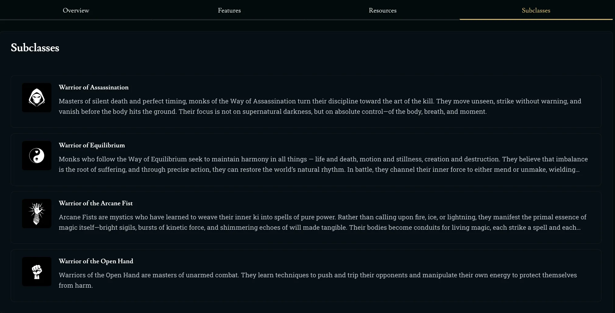 Homebrewing classes now feels complete, with class features, subclasses, and resources (rage, focus points, mana, etc.).