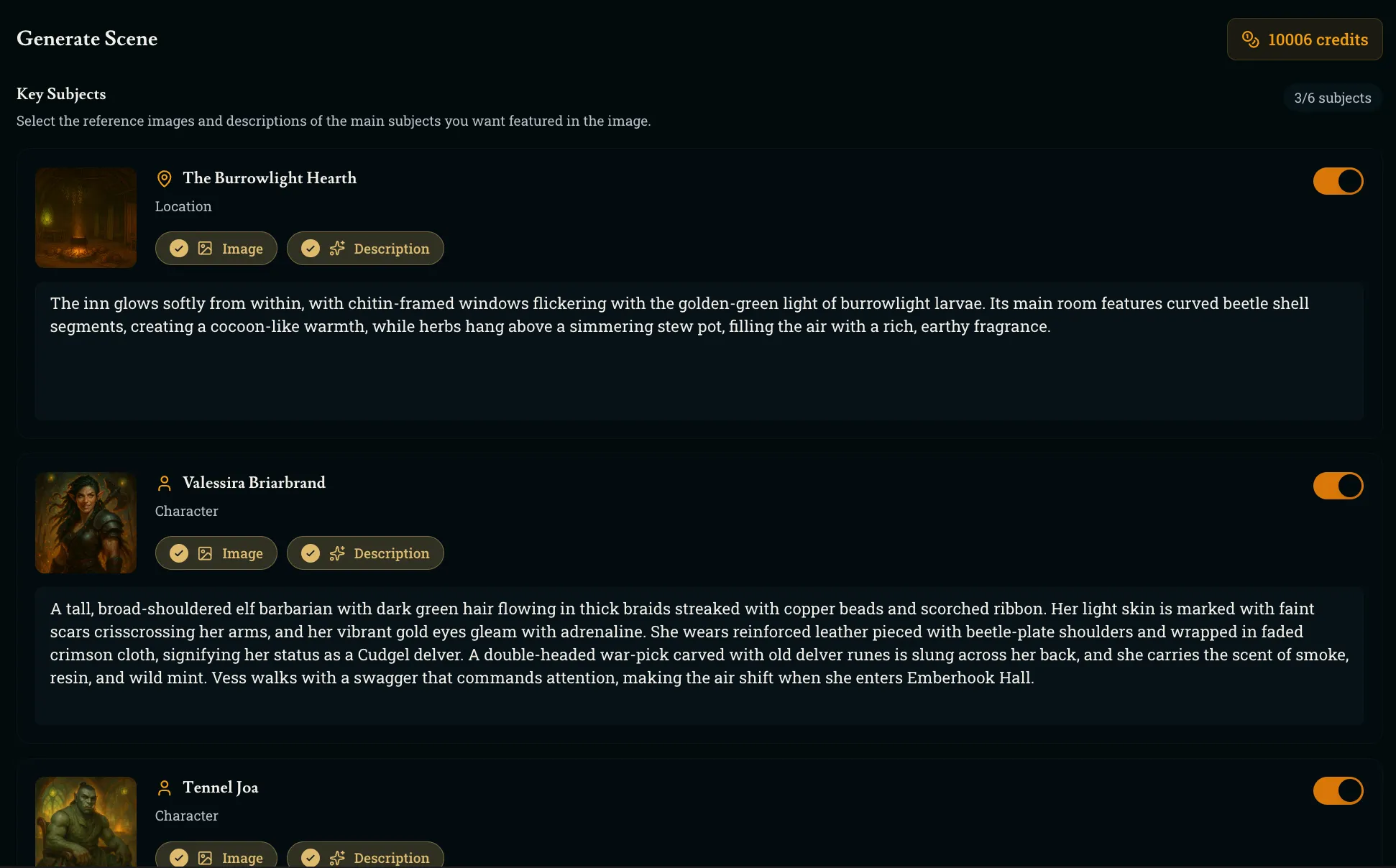 Confirm the characters and images you want included in the scene along with any additional instructions and then watch them come together. Note that for Scene Generations, Nano Banana Pro is recommended as it’s much better at adhering to the current world style and handling multiple subjects at once. Scene generation is also only possible with the premium image models so it does consume credits; use it wisely when you want to capture those epic moments!