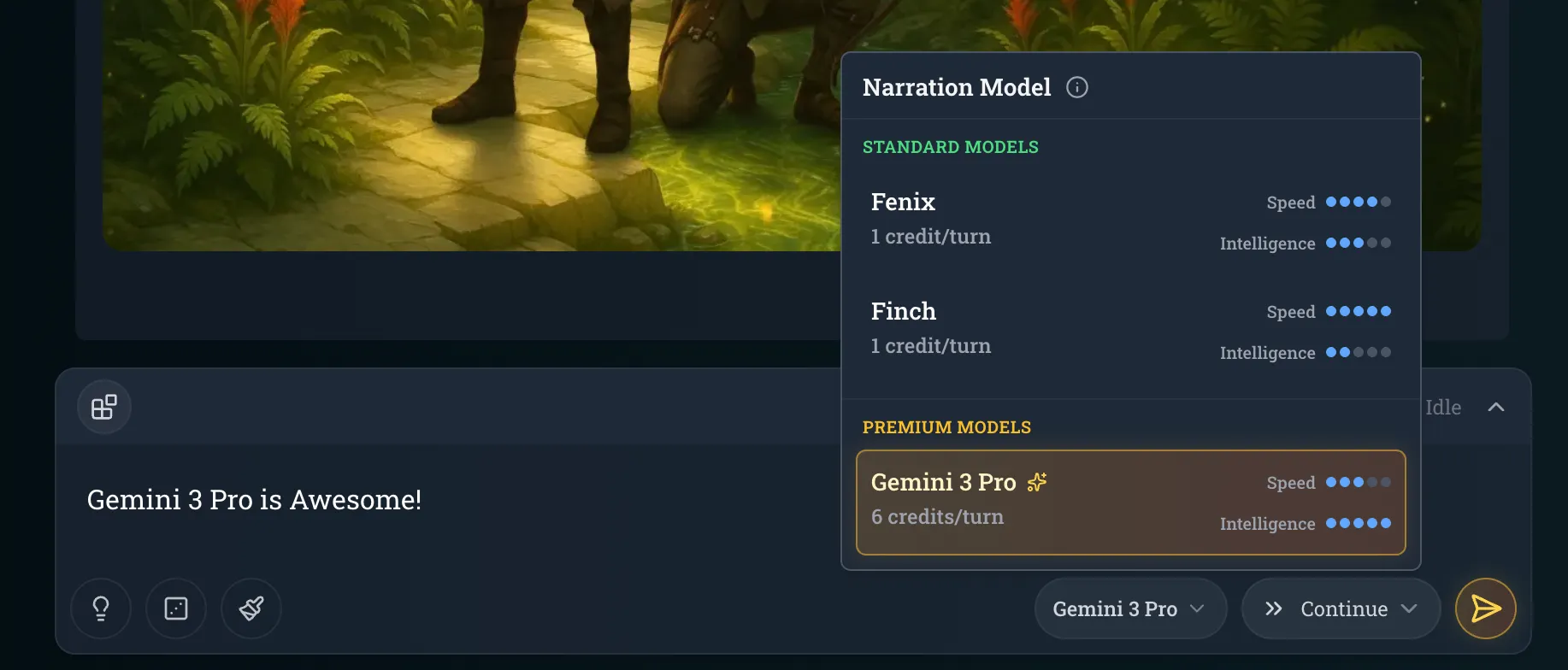 Over time we’ve had a ton of users ask us about including larger language models to play with, so we’ve decided to bring you the best one! As of today, Gemini 3 Pro is available as a premium narration model and will cost 6 credits per turn. According to external benchmarks, Gemini 3 Pro is currently the smartest model available.