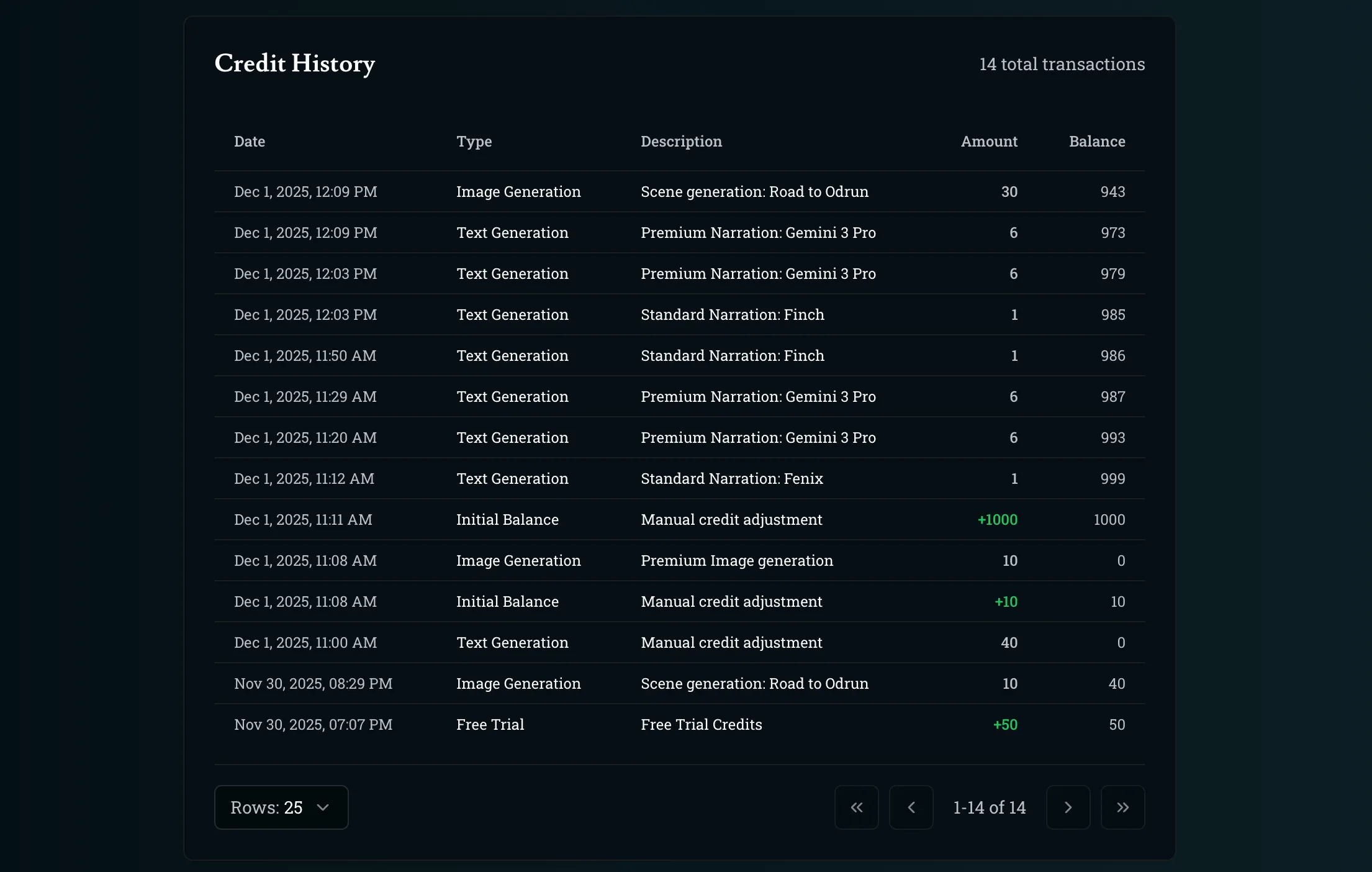 You can now go to your account page to see your credit usage history. You should see your current amount of credits as the first row detailing your ‘Initial Balance’. We will also not charge your credits in the case that one of the models errors out, and you can always use this credit history to double check.